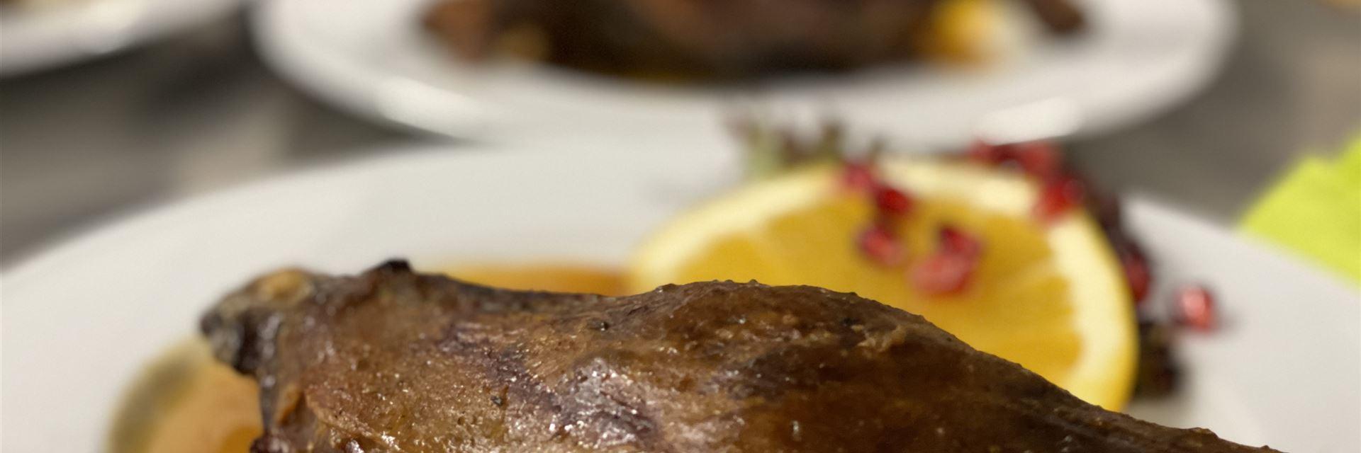 Gänsekeule | Apfelrotkohl | Preiselbeer Rosmarin Sauce | Kartoffelklöße a,i,j |
