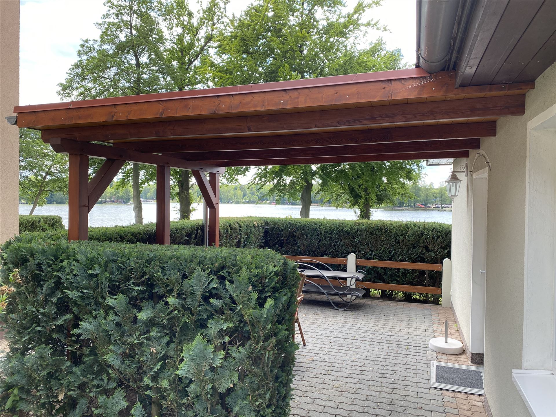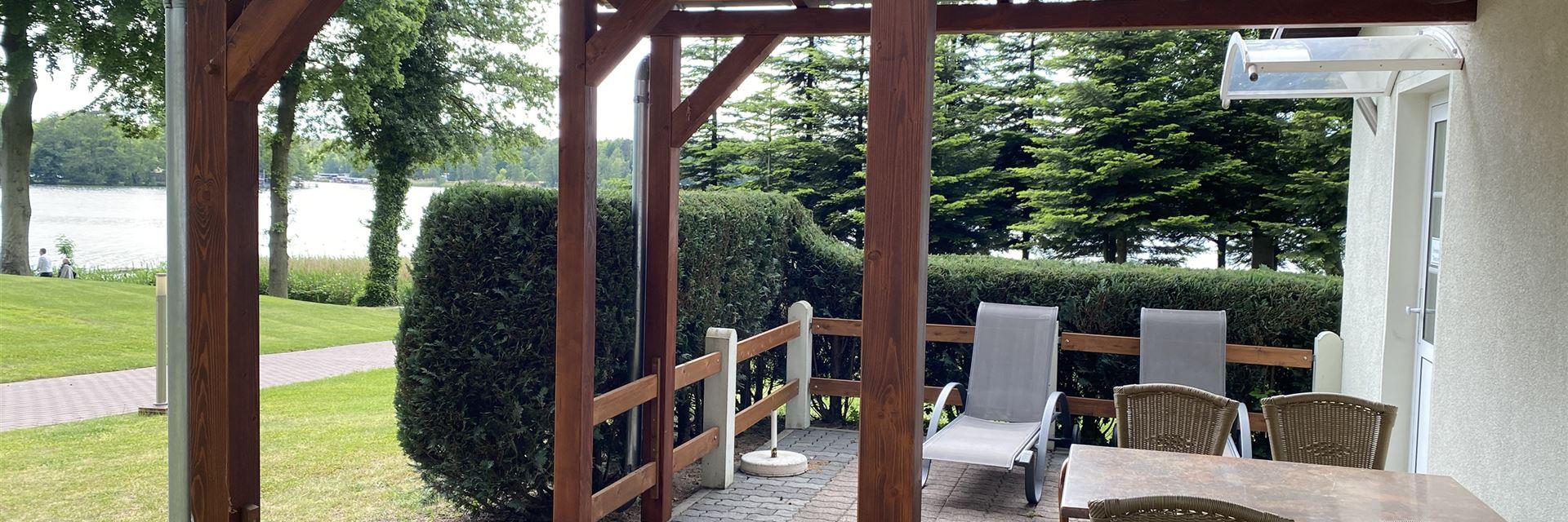 • überdachte Terrasse mit Seeblick und Gartenmöbeln